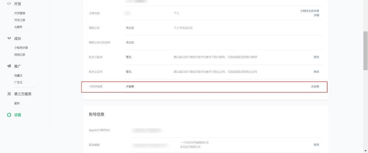 开发者可在小程序后台首页点击【去备案】即可进入备案流程。