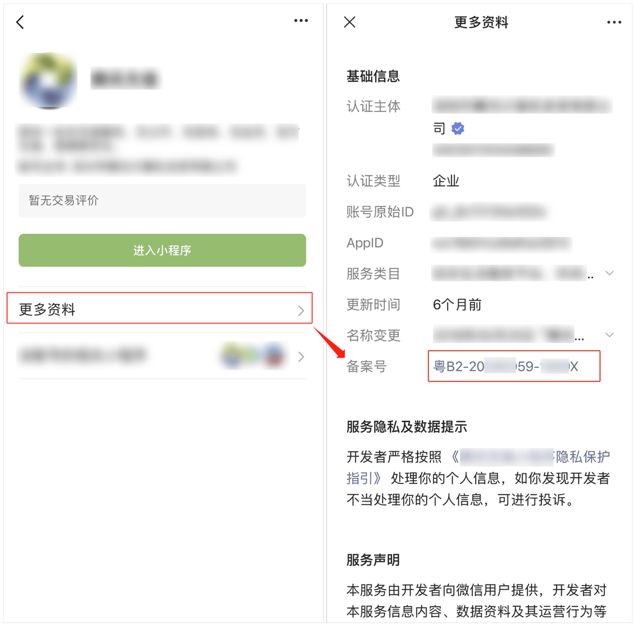 小程序成功发布上线后,小程序备案号将自动展示在小程序更多资料页,无需开发者自行悬挂。示例如下: