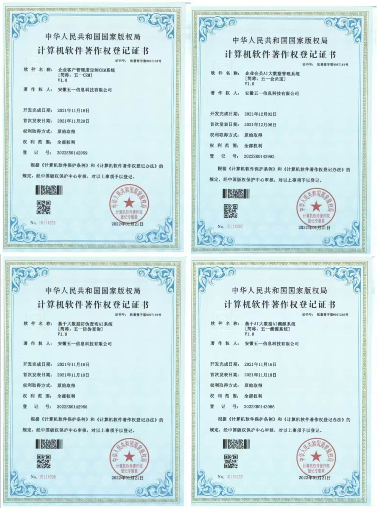 2022年1月21日,获得了基于AI大数据AI溯源系统【简称:五一溯源系统】,显示了其在AI领域的领先地位。