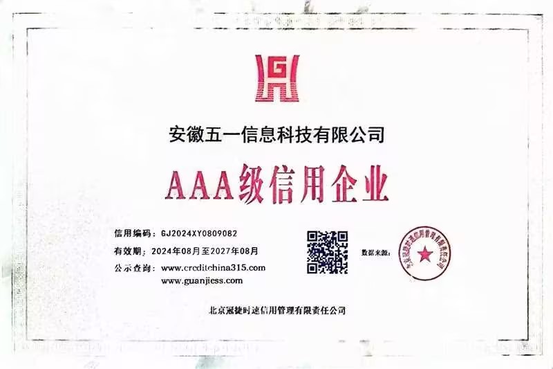 2024年8月27日,安徽五一信息科技有限公司荣获资信等级AAA的荣誉。